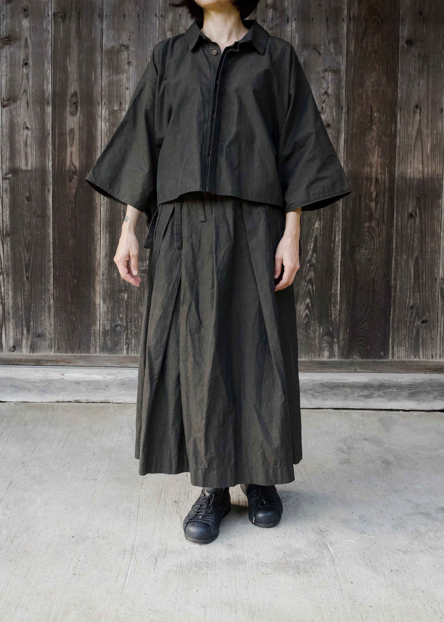 一見するとショート丈の袖口の広いシャツのように見えますが、腕を広げると着物スリーブになっています。