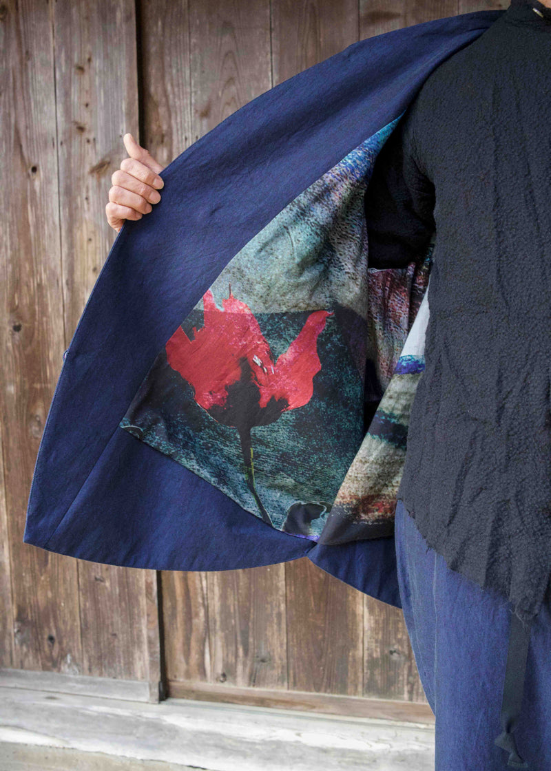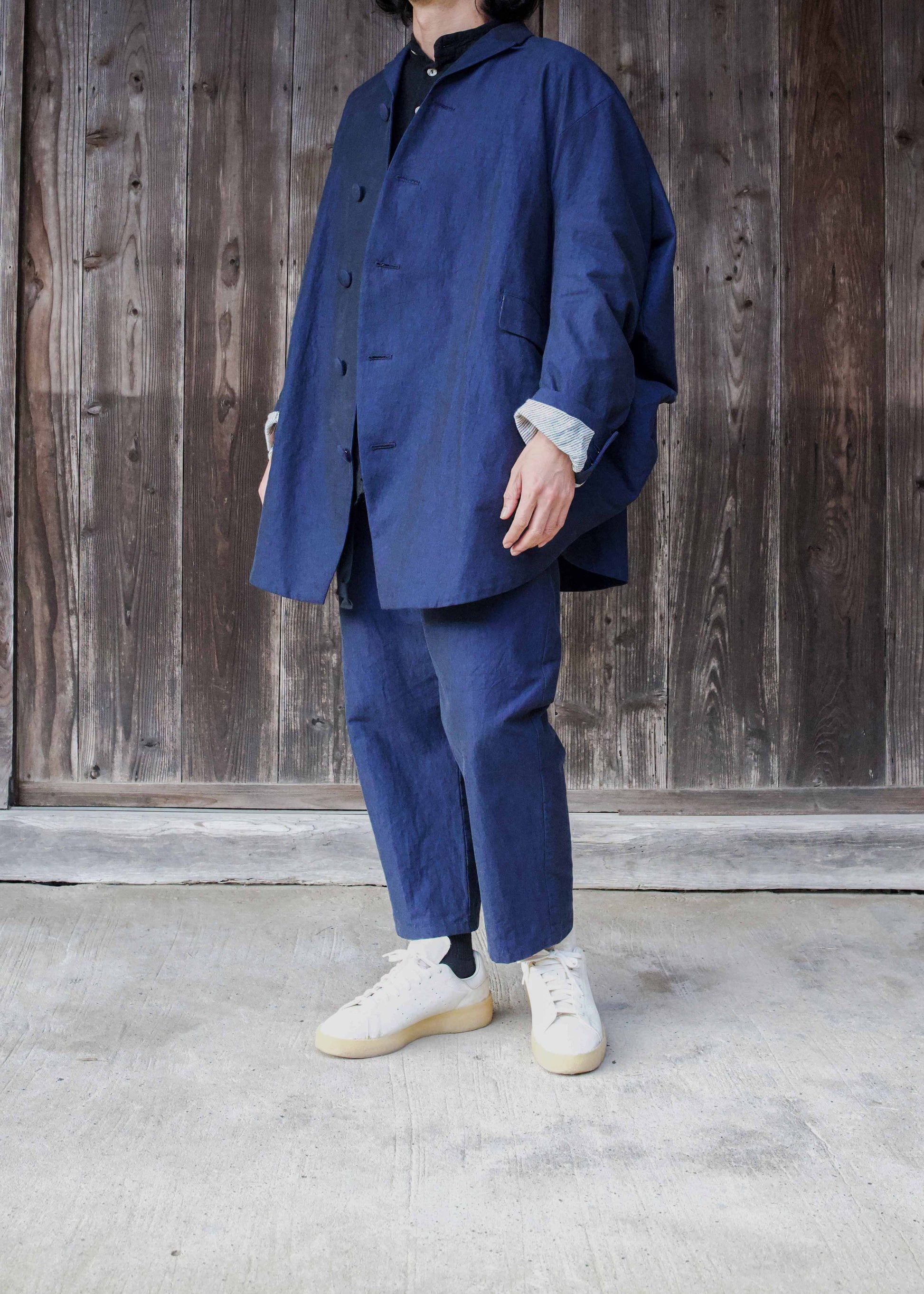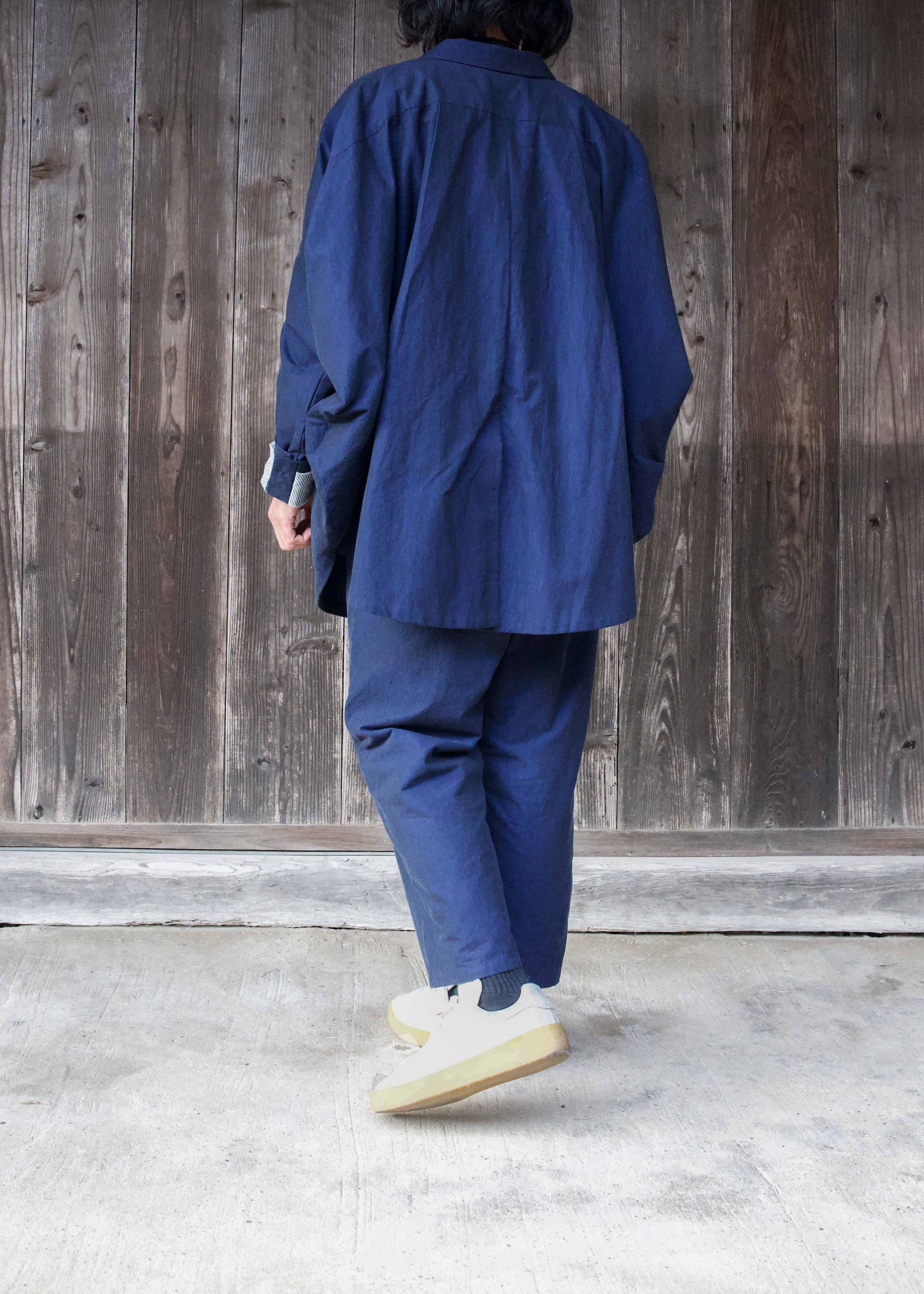 Woven by a weaver in Nishiwaki City, Hyogo Prefecture, renowned for its yarn-dyed cotton. The colour selected from countless yarn shades was reportedly a ‘colour woven for the first time’, resulting in a captivating fabric with depth created by the layered shades of chambray. The thickness and texture were also discussed during production, making this a truly unique fabric.
