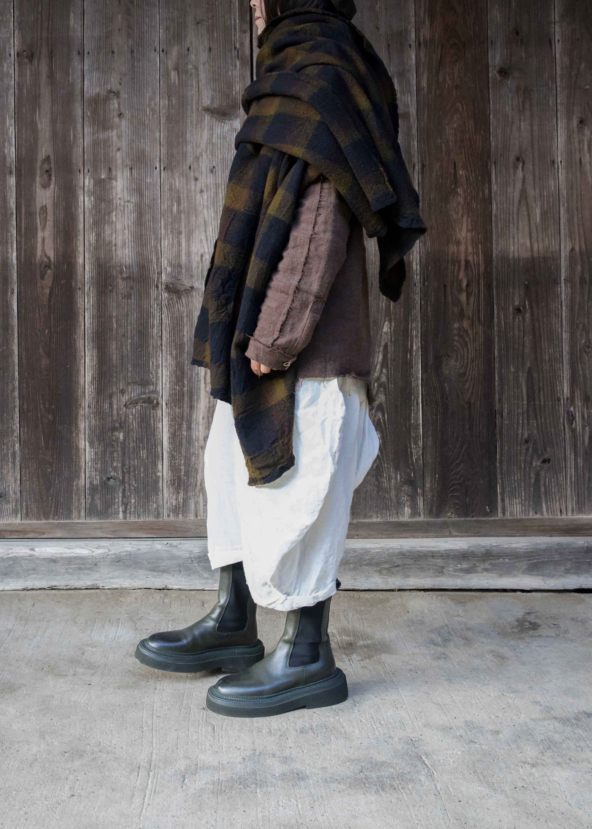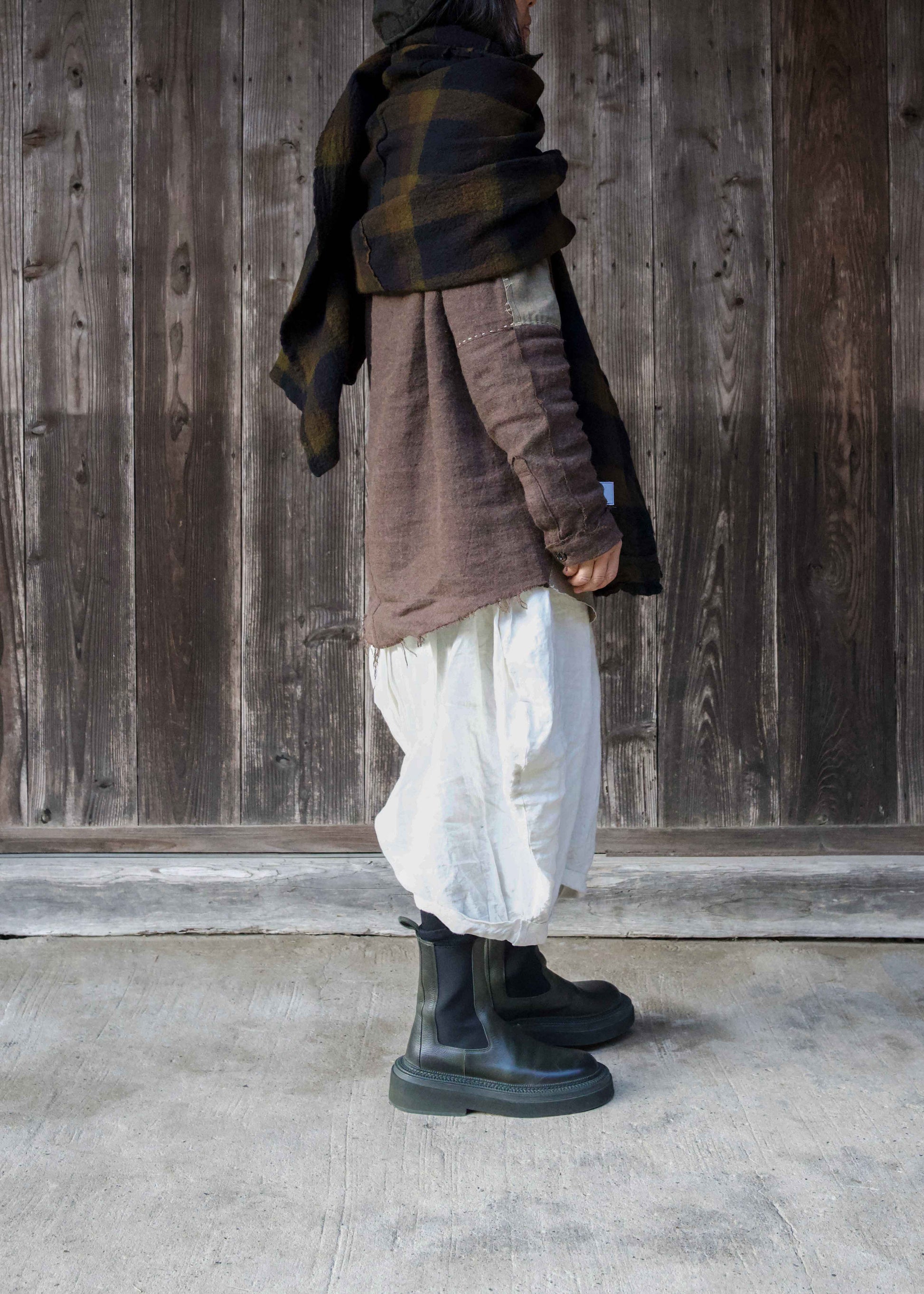 This twill weave uses thick yarns for both the warp and weft. Using a process called " hydrofulling ," which is suitable for wool, we create more space between the fibers of the fabric, achieving both lightness and volume. Enjoy the warmth and softness of this fabric.