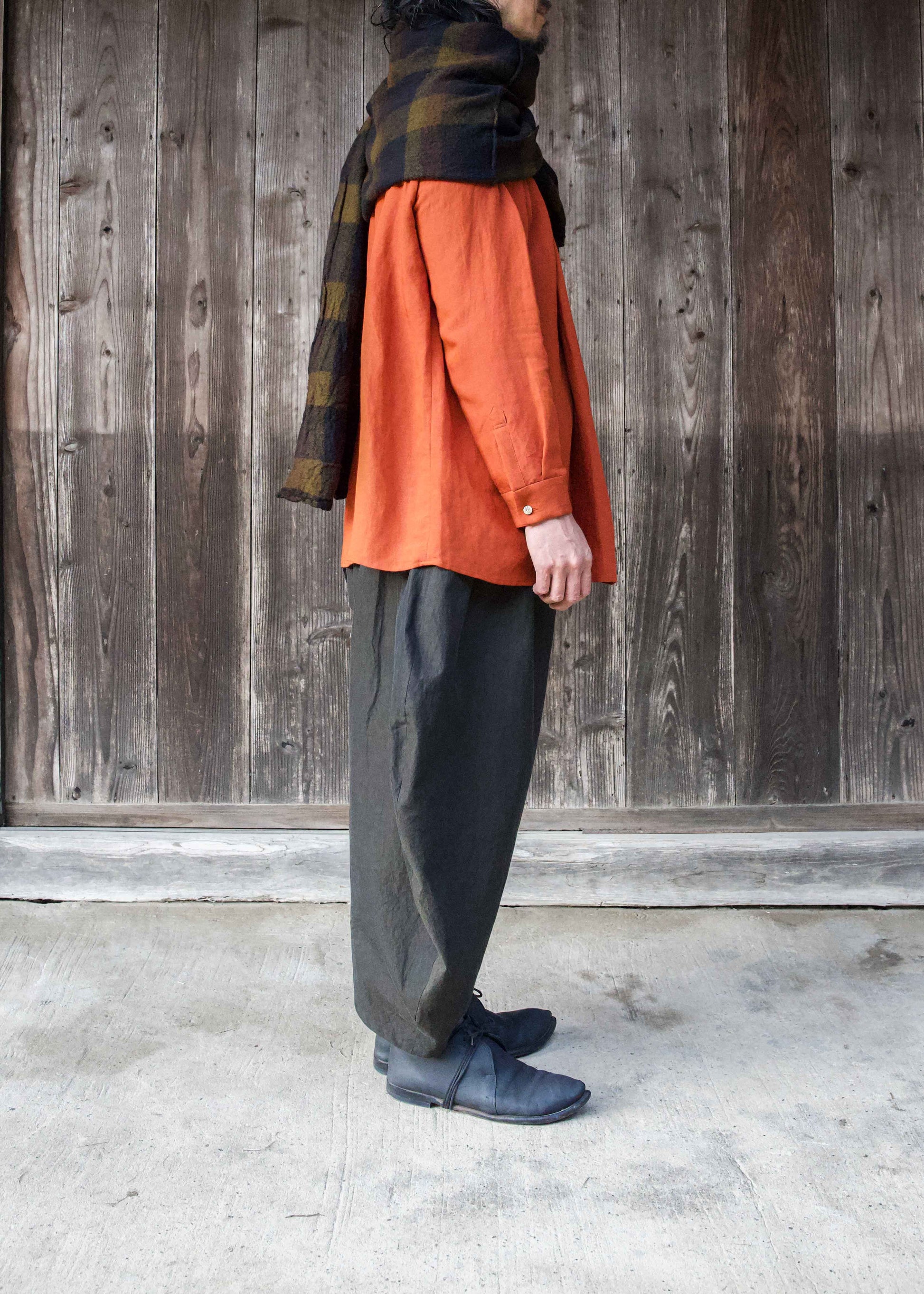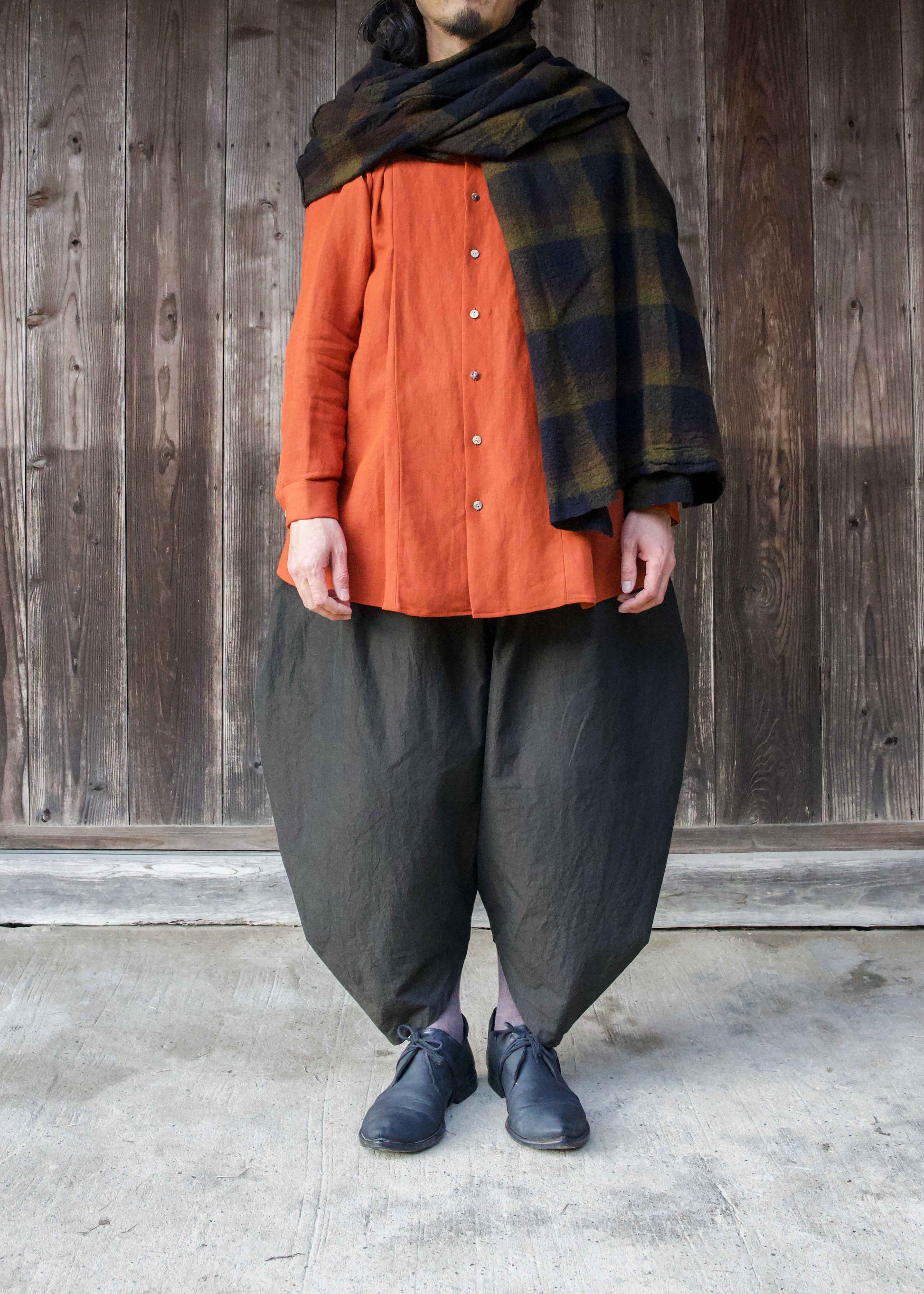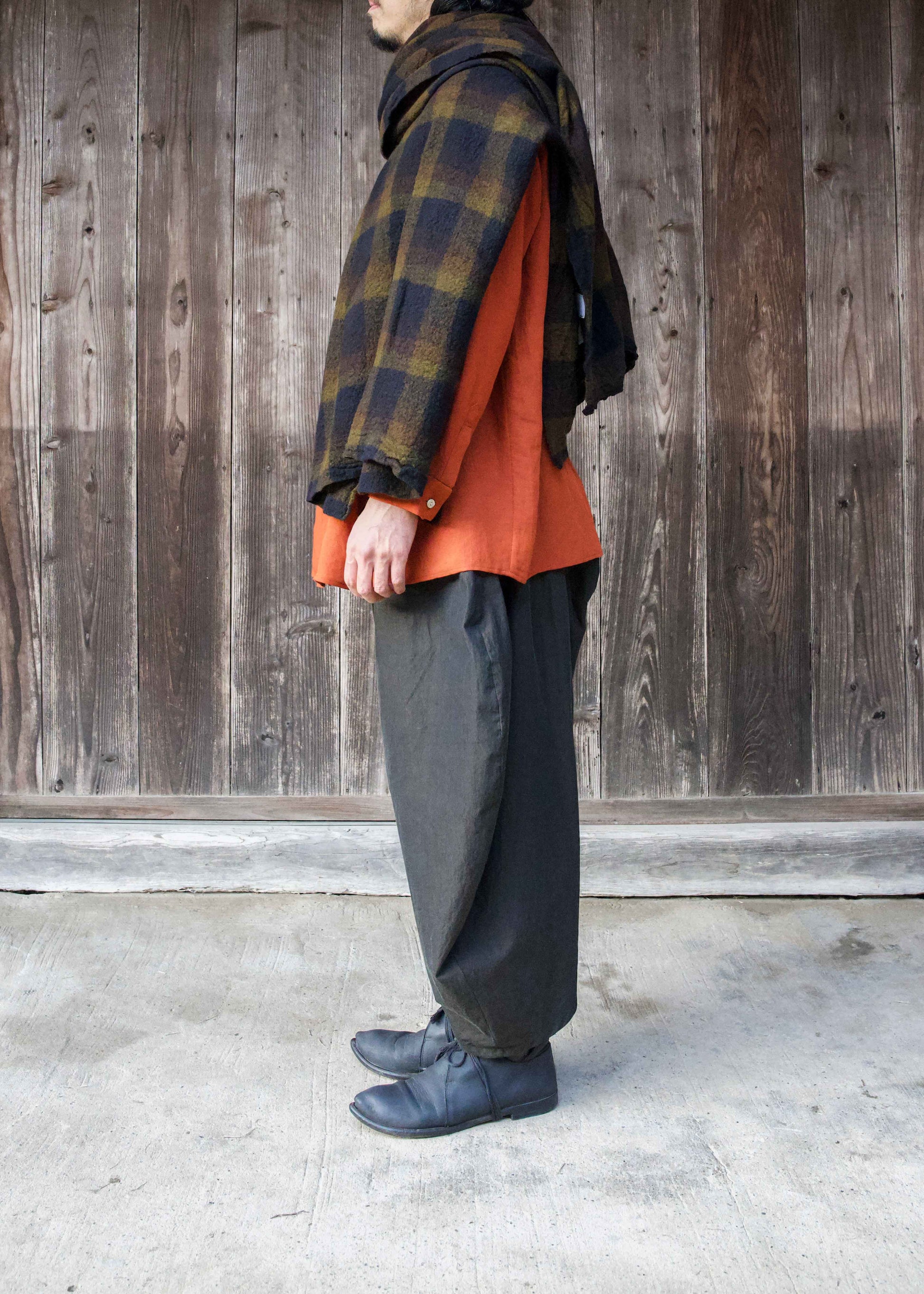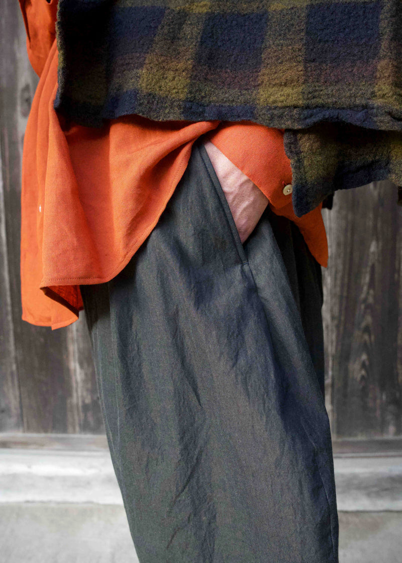 The fabric is woven by a weaver in Nishiwaki City, Hyogo Prefecture, a production center for yarn-dyed cotton. The color chosen from countless threads was apparently "a color they had never woven before," and the overlapping colors of the chambray resulted in a fascinating fabric with depth. The thickness and texture were also discussed, resulting in a one-of-a-kind fabric.